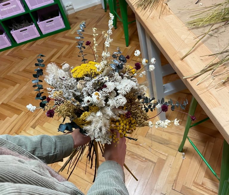 In diesem individuellen 1:1 Workshop lernst du, deinen eigenen Brautstrauß aus Trockenblumen zu binden – ganz nach deinem Stil und Farbkonzept. Du wendest dabei die Spiraltechnik an und gestaltest dein einzigartiges Arrangement, das dir auch nach der Hochzeit noch lange Freude bringt. Perfekt für DIY-Bräute oder als besonderes Erlebnis vor der Hochzeit! Termine auf Anfrage.