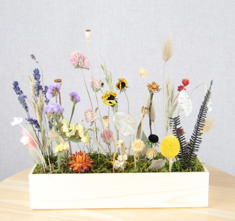 Du kreierst deine bunte Trockenblumenwiese in einer kleinen Kiefernholzkiste.