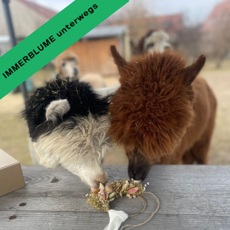 Workshop unter Alpakas in Dresden. Kleinen Trockenblumenring auf der Wiese unter neugierigen Alpakablicken gestalten.