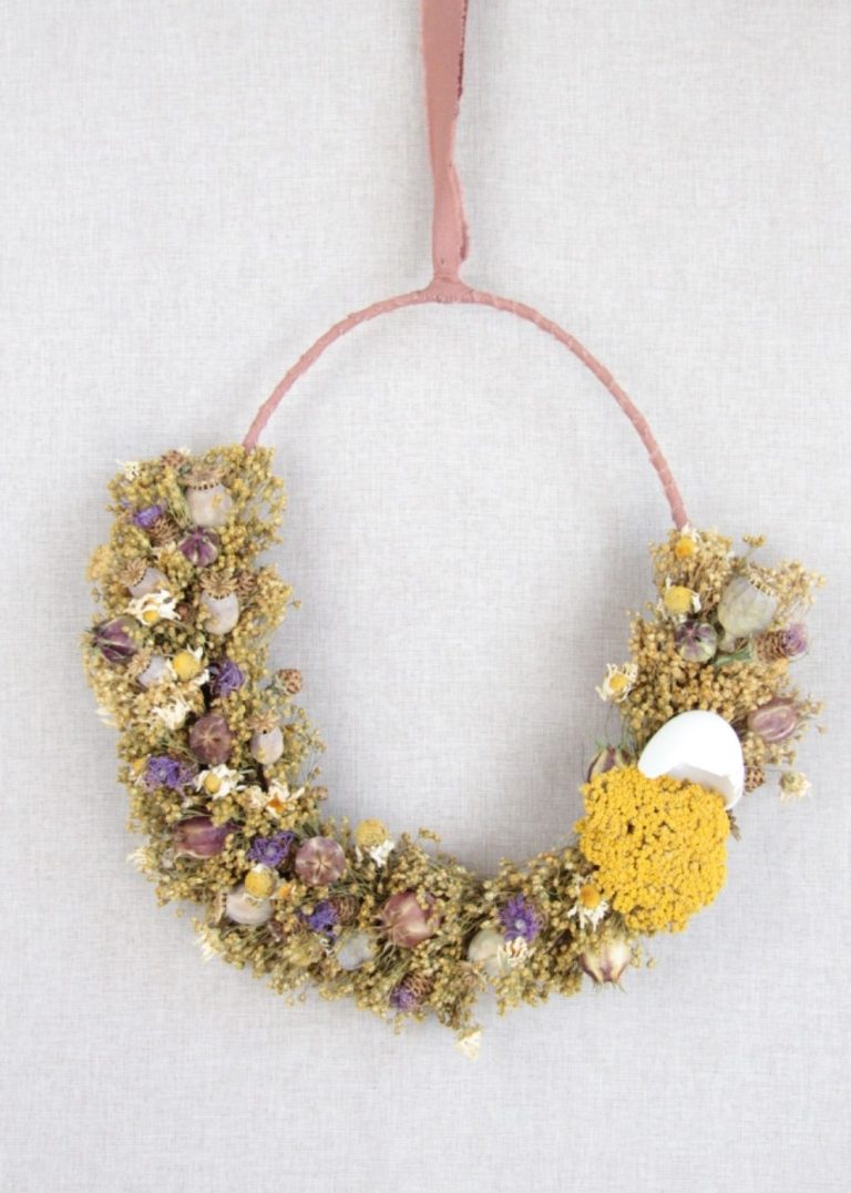 Der Ring wird zunächst mit Stoff umwickelt und anschließend mit ausgewählten Trockenblumen und Naturmaterialien verziert. So entsteht ein leichtes, modernes Werkstück, das sich harmonisch in die Frühlings- und Osterzeit einfügt.