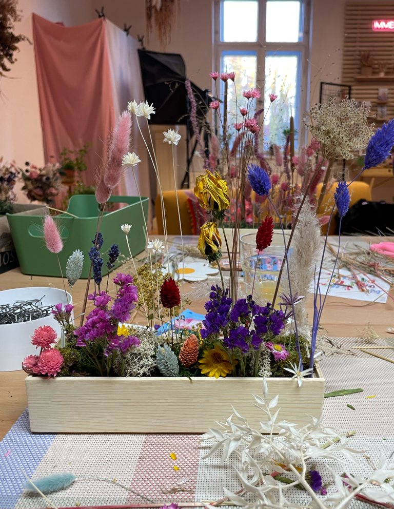 Am Ende nimmst du ein liebevoll gefertigtes Unikat mit nach Hause: eine langlebige Trockenblumenwiese, die dein Zuhause schmückt und dich lange an deine kreative Auszeit erinnert.